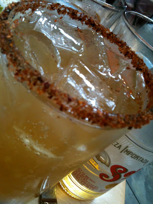 This one was a mixture of Cerveza Sol with mango and lime juices. While the combo of beer and fruit juices was appealing, what really won me over was the rim, which was coated with a mixture of salt and crushed chili peppers. It reminded me of Thailand’s prik kab klua, a dry mix of salt, sugar and crushed hot chilis that you dip slices of fresh fruit into. Most every meal I’ve had in Thailand has ended with a platter of fresh fruit and a bowl of this sweet-salty-spicy mixture.